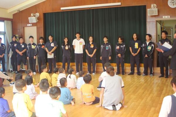 昨日、海洋高校3年生との交流会が行われました。今回は海洋開発科海洋技術コース3年生14名が来園しました。船に乗る技術を学んでいる生徒さんたちです。以前、海洋丸の30日航海の時、小泊港に船が帰ってくる際この生徒さんたちを本園の子どもたちが港にお出迎えに行ったことがありました。今回はその生徒さんたちを園に迎えたということです。