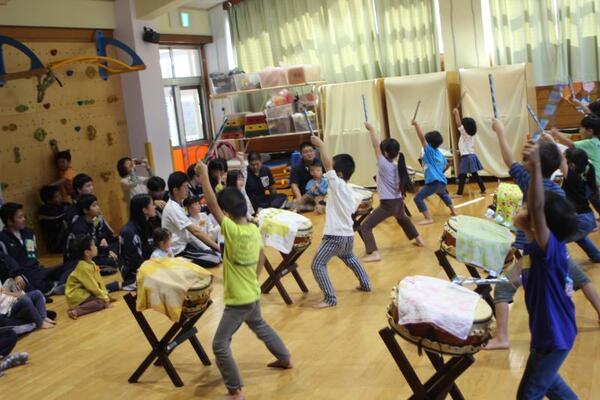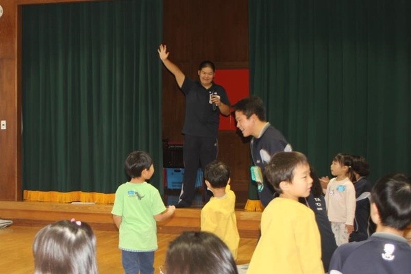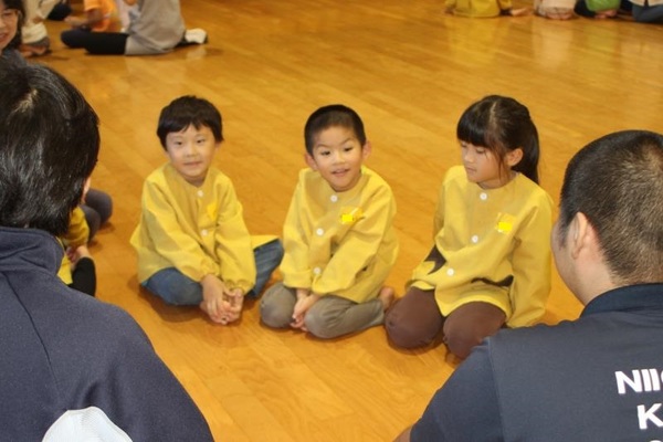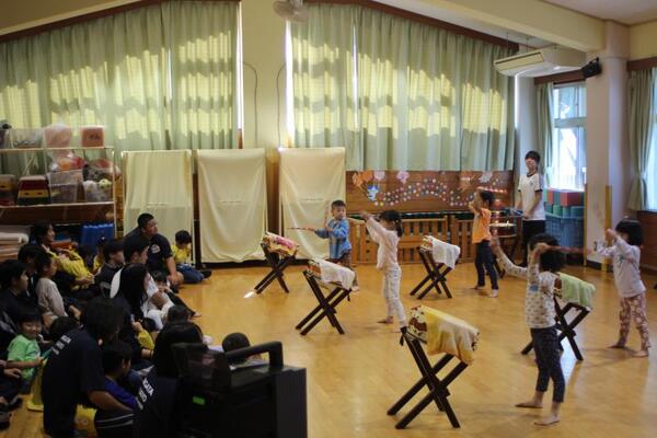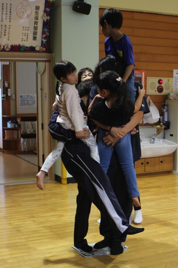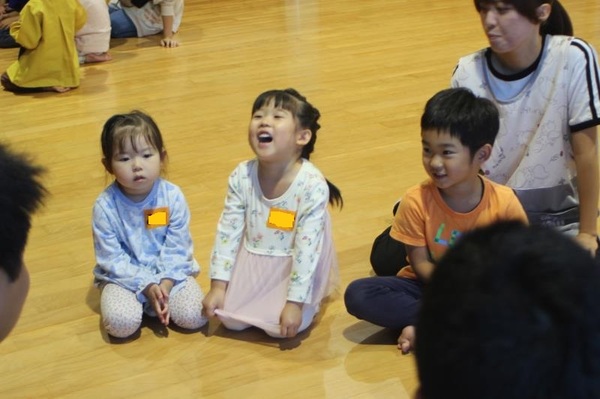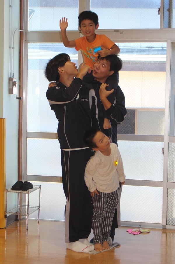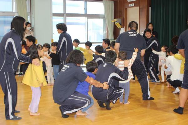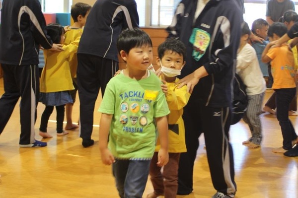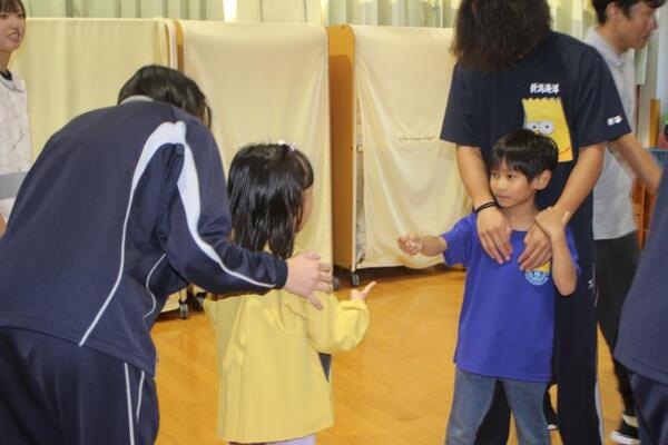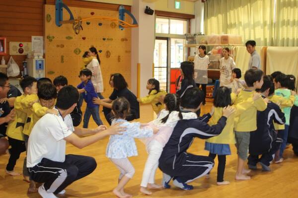 そのご縁もあってか、会が始まる最初から、生徒さんたちは子どもたちと仲良くなろうとする気持ちがあふれていました。笑顔で子どもたちに話しかけ、手をつないだりおんぶしたりしてくれましたよ!ジャンケン列車やジャンケン新聞紙ゲームでは高校生のリードで大変盛り上がりました!
