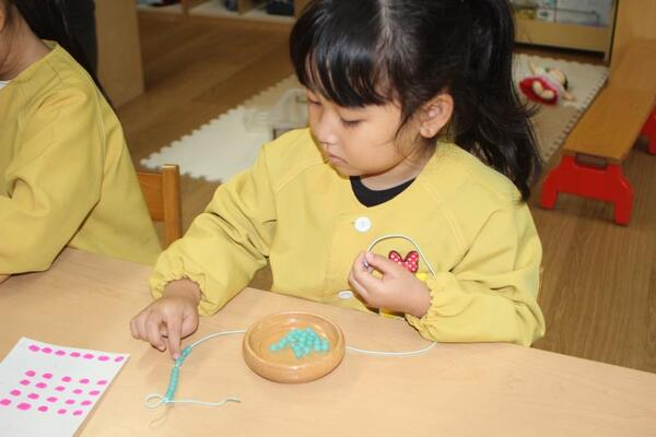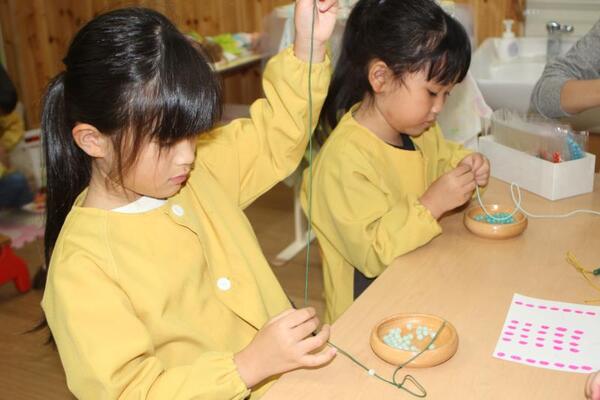 まずひかり組さんが始めたのは、本堂にお越しいただいた大人の方にプレゼントするためのお念珠作りです。お念珠の珠の数が決められているので図を見て「1・2・3…」と、いっしょうけんめい数えながらのお念珠作りです。小さな玉の穴に紐を通すのもなかなか難しく、紐の先を斜めにカットしたりボンドで固めたりしての挑戦です。「ありがとう」の気持ちを込めながら一つひとつ作っていきます。