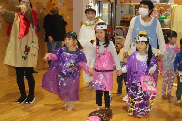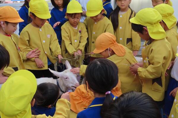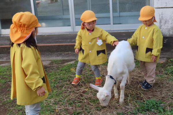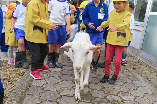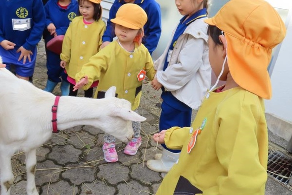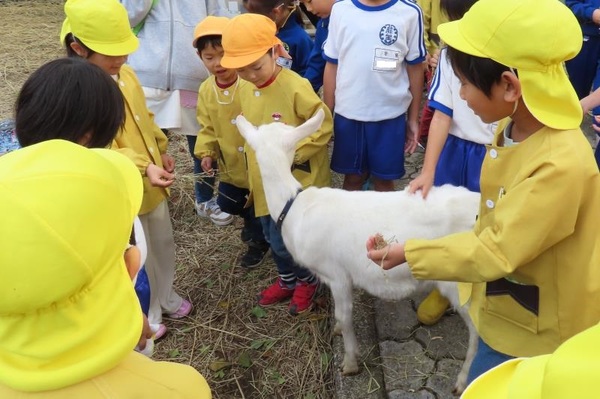 昨日、能生小学校1年生との交流会が行われ、ひかり組さんとくるみ組さんが能生小学校へ招かれました。1年生が飼育体験をしているヤギをきっかけにしての交流会のお誘いを受けたもす。会の最初には、1年生からヤギの紹介や、食べ物やうんちについてのク楽しいクイズがありました。1年生のお話から、子どもたちはヤギへの興味関心がふくらみ、近づいてみたいな!触ってみたいな!という気持ちがモリモリ出てきたようでしたよ!
