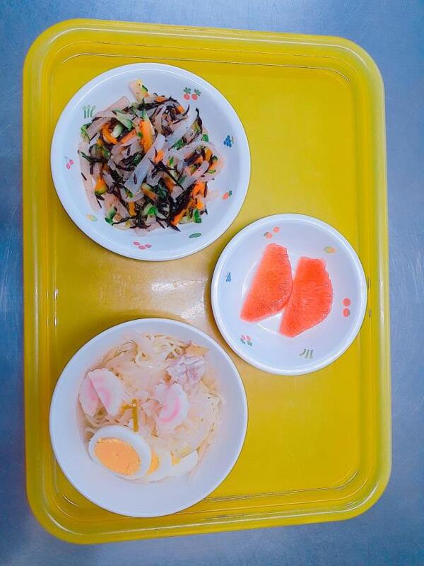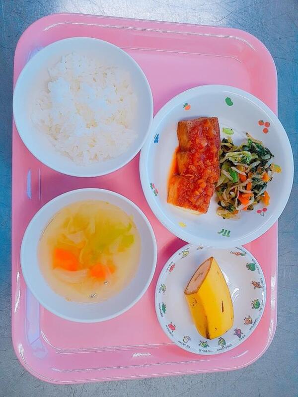 今日の厚揚げは、ケチャップと醤油で中華風の味つけでした(辛くないエビチリの味を想像してみてください)!初めて提供される味でしたが、どうだったでしょうか?「ケチャップ味おいしい!」と言って、しっかりとケチャップを感じてくれていた子がいました。お部屋では、先生が子どもたちに献立を伝えている様子がよく見えるので、メニューを聞いて覚えている子もいるようです。おかわりに来るときに、献立に書いてある料理名を一生懸命伝えてくれる子もいます。