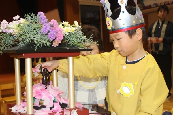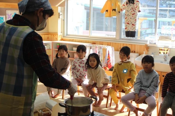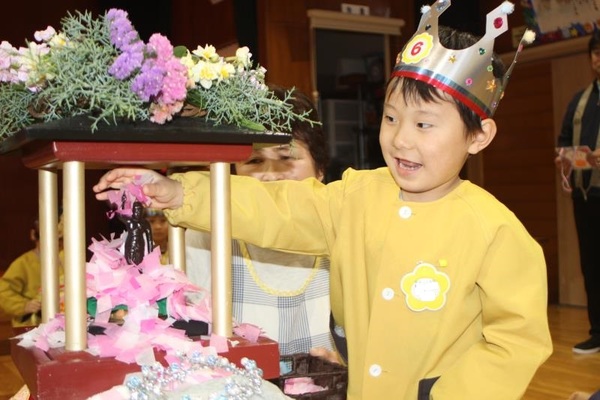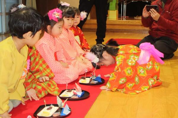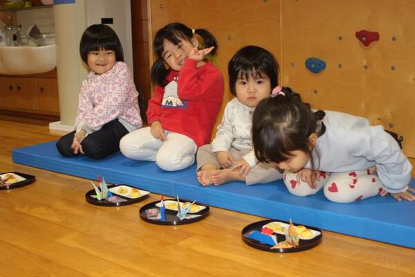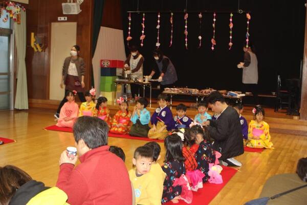 今日は、遊戯場にて小正月のお楽しみ会を行いました。園内でのもちつきなどの機会が無くなり、年賀状の交換も少なくなってきましたね。子どもたちの周りにお正月らしさがどんどん減ってきているように思います。本園では、昔ながらのお正月遊びや慣習等できる限り子どもたちに伝えたいなと考えて遊びや行事に取り入れています。この小正月の会もその一つと言えます。