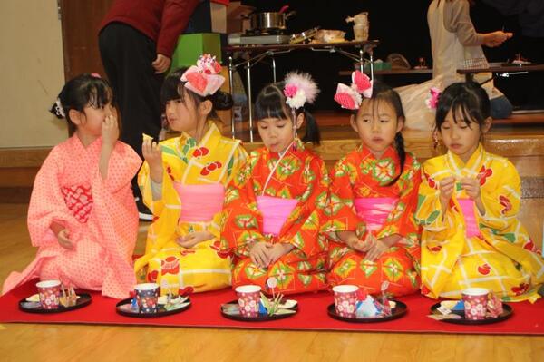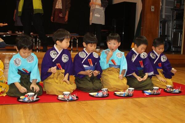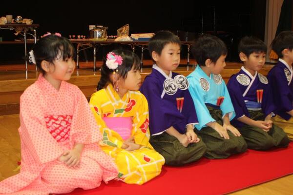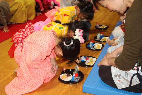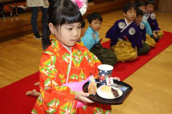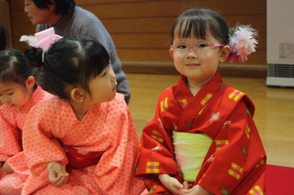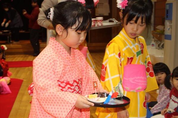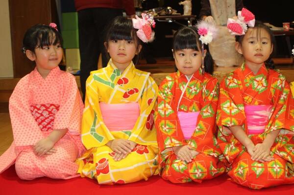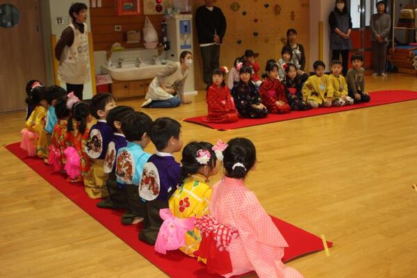だんだんと外は気温が低く雪がふぶく大荒れの天候ですが、園内はこの日のイベントを楽しみにする子どもたちの気持ちが盛り上がっていてホカホカとしていましたよ!この会では正月気分を味わおうということで、3年前ほどから年長児(女の子は年中・年少児も)が着物を着ることを楽しんでいます。