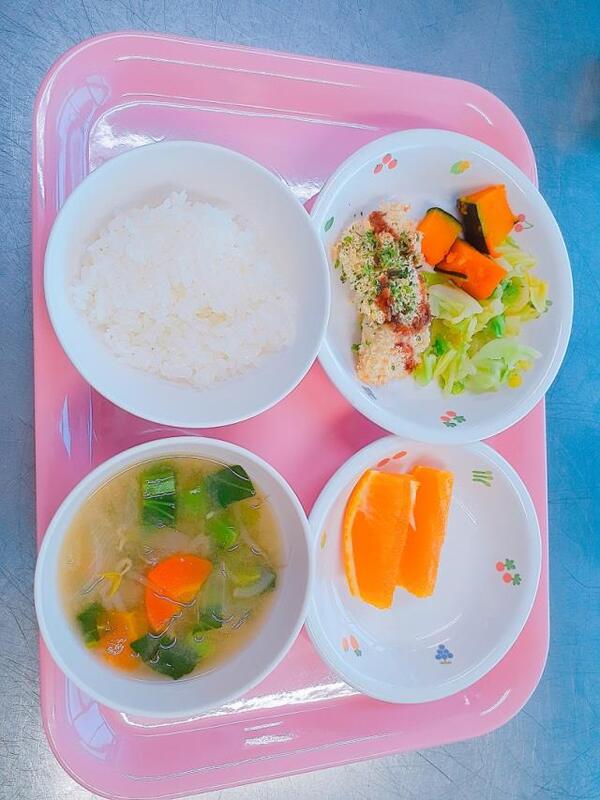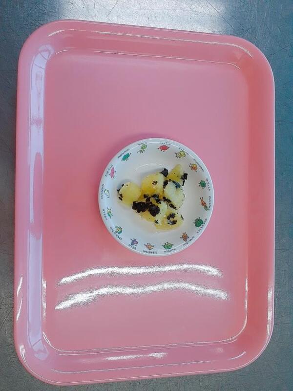 今日は魚の磯辺焼きです。魚はカレイを使用しています。パン粉をつけてオーブンで焼いてあるのでさっぱりとしていました。