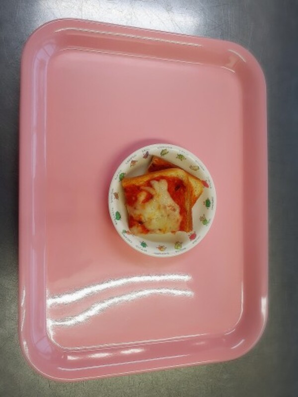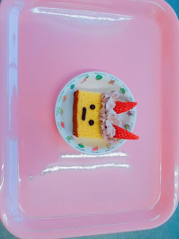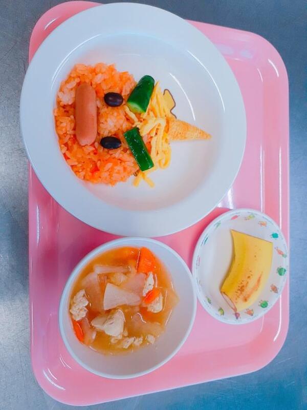 今日は節分献立でした。以上児は鬼の顔を自分で作って食べました。いろいろな表情の赤鬼の顔ができていましたよ!