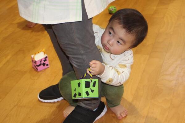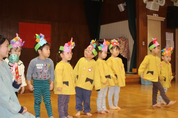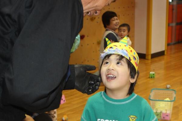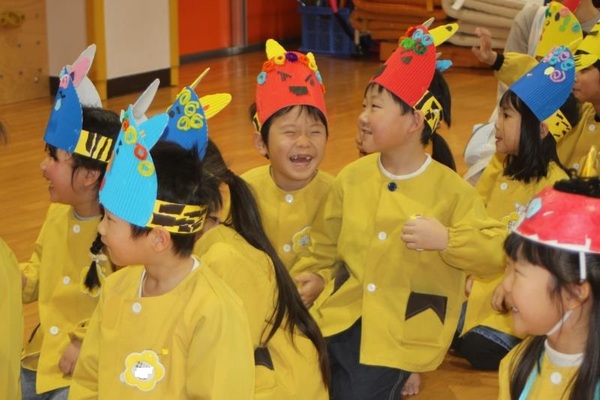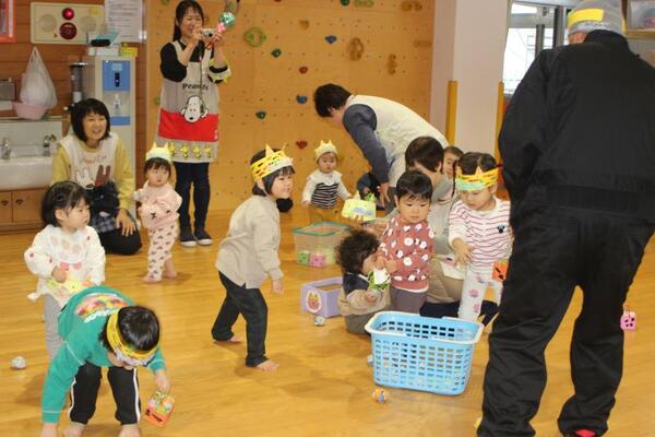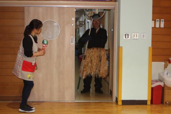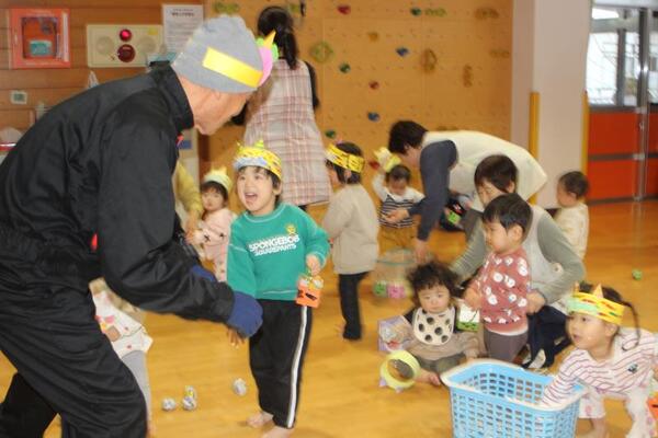 以上児さんの前に現れた鬼も、例年よりずっとやさしい鬼さんでした!遊戯場に入って来た姿を見て、思わずホッとしたのか大笑いした子もいたようです。