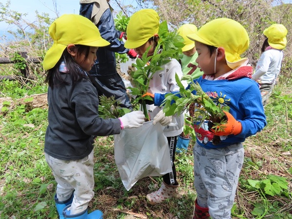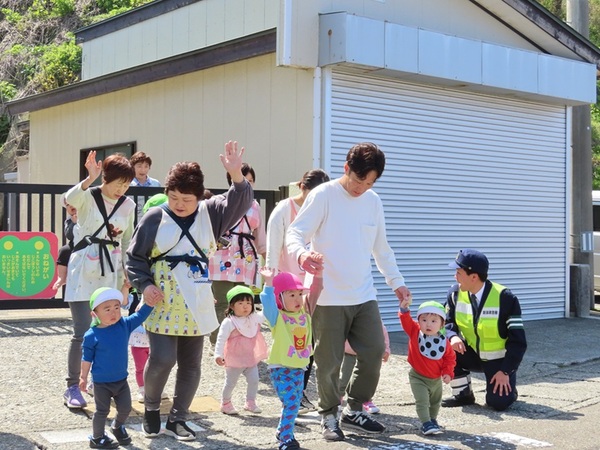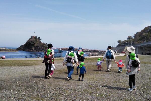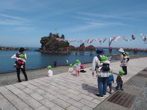 先週末、2階保育室の窓から海を見ていると、弁天浜にこいのぼりが上がっているのが見えました。