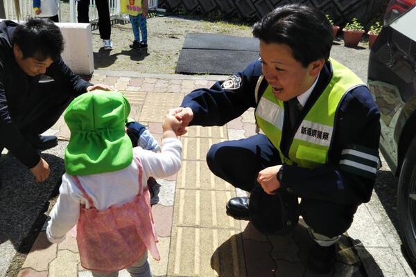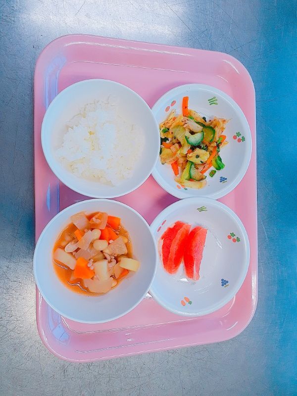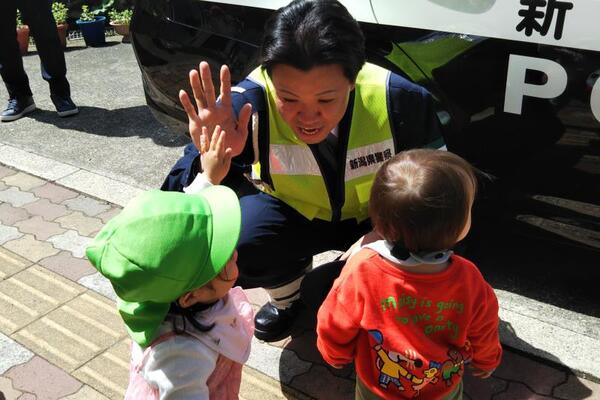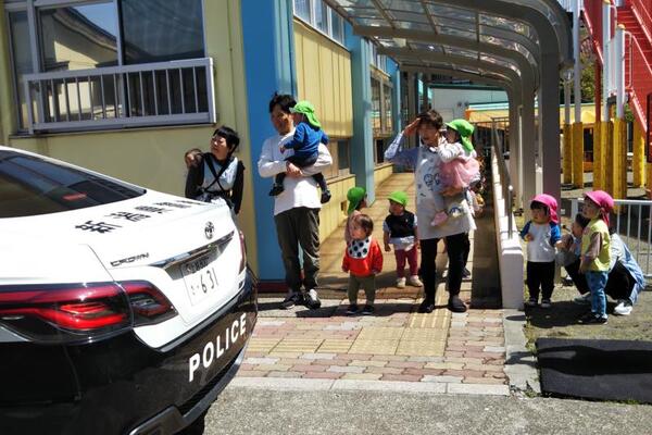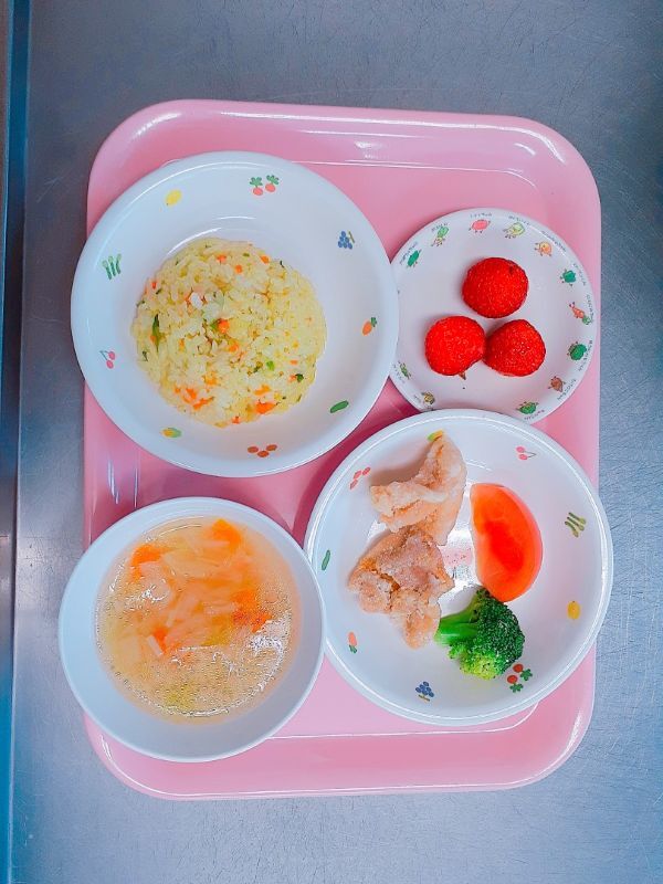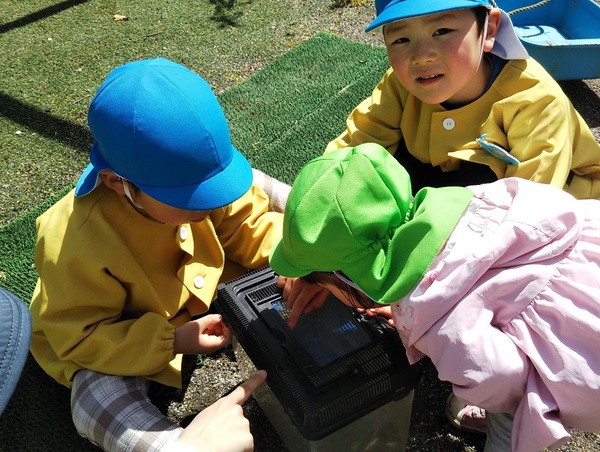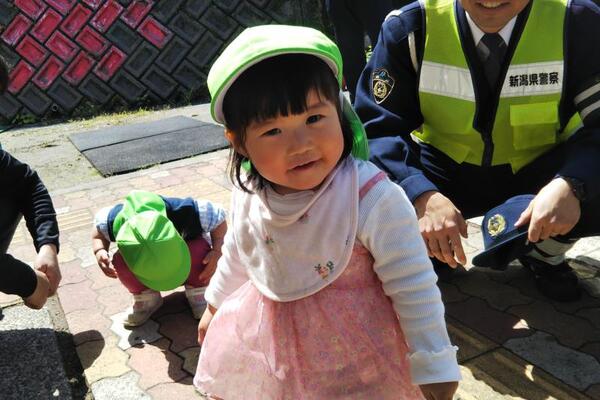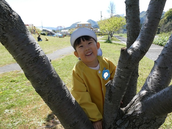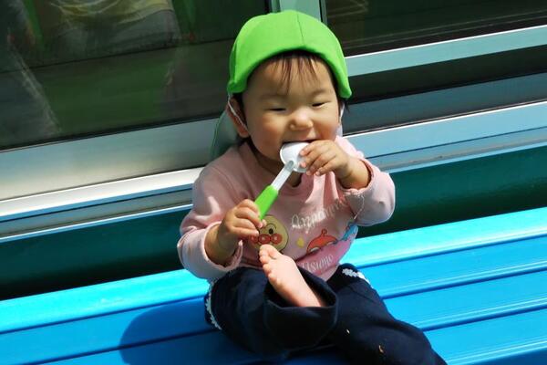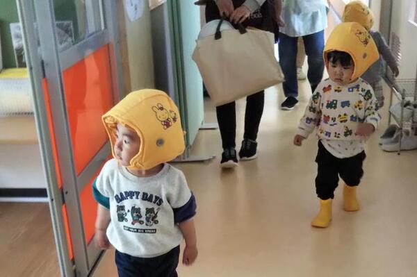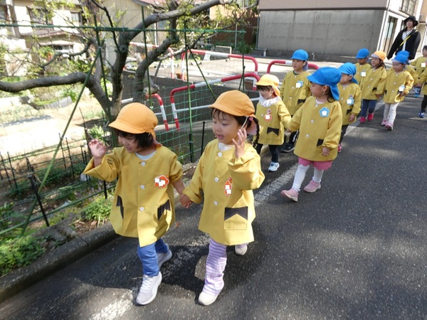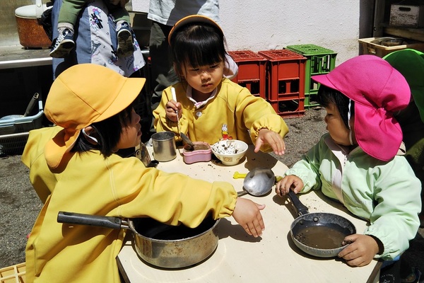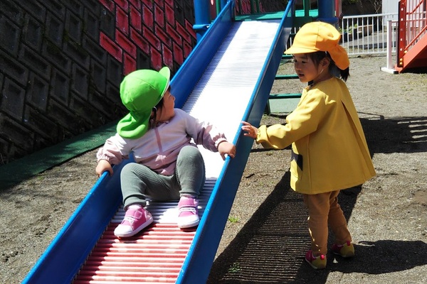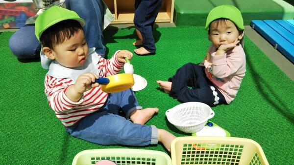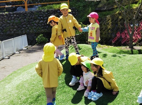 これは先日の園庭での様子です。クラスによって異なるいろいろなカラー帽子のこどもたちが一緒に遊んでいる様子が見られます。先日入園したばかりのこどもたちにも、大きいクラスのこどもたちは遊びに誘ってくれたり、声をかけてくれたりしています。