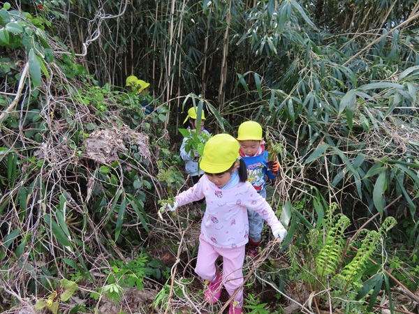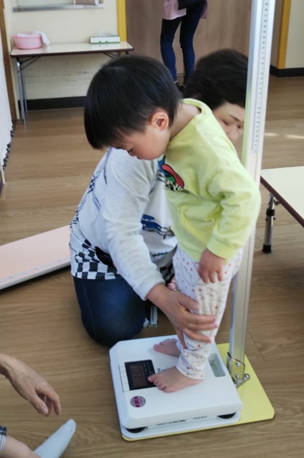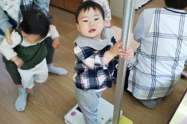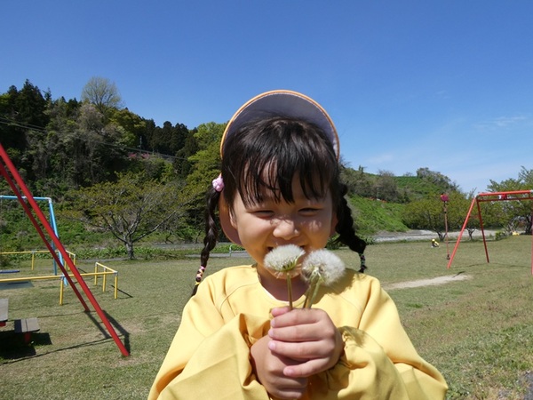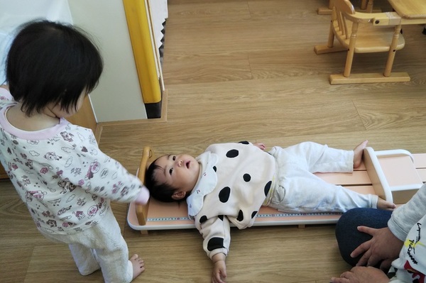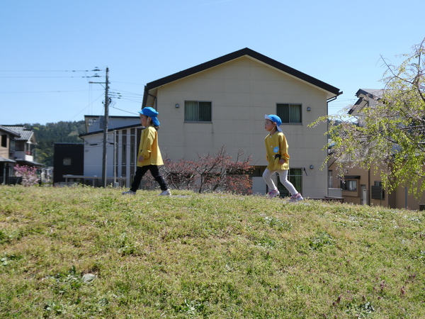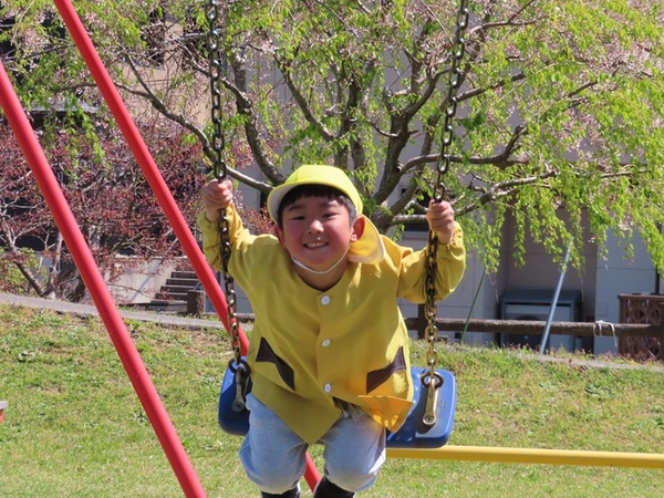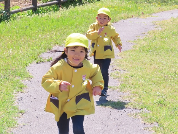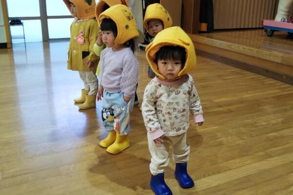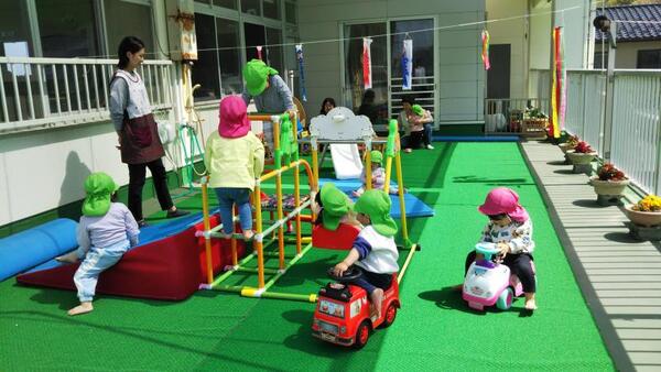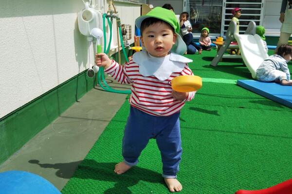 未満児さんは2階保育室やテラスで遊んだり、1階遊戯場、また園庭で遊ぶこともあります。園庭では以上児のこどもたちと一緒になって遊ぶことにより、また以上児の遊びを見ることにより、刺激を受けています。