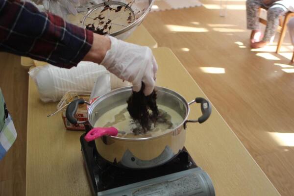保育者が『かいこ』の説明をして写真を見せたり、まゆを振ったり、まゆを半分に切って見せると、中から出てきた茶色の乾いた『かいこ』にビックリ!昨年ずっと育てていたちょうちょを思い出して、「ちょうちょの幼虫と似ているね!」と言っていた子もいました。