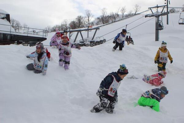 ペアリフト前まで、極ゆるやかな斜面を登ることには、ずるずると後ろに下がりながらもいっしょうけんめい挑戦していました。がんばって上ったごほうびは、そこからセンターハウスまで10mほどの滑走(?)です!これにはみんな大喜び!苦労して坂を上った後に滑り降りる小さな爽快感を(ちょっと大げさですが…)楽しんでいましたよ!