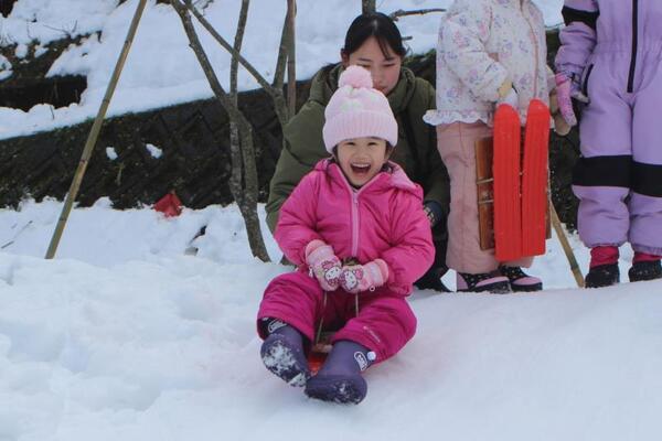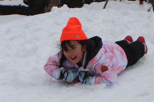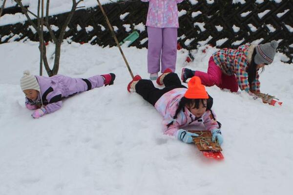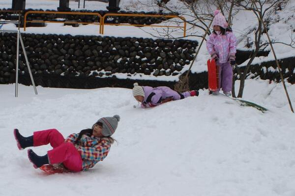 昨日遊んだそりの斜面はかたくツルツルにしまり、絶好のそりゲレンデになりました。今日も、何人もそりを持って築山の頂上からの滑りを楽しみ、転がっては大笑いしていましたよ!