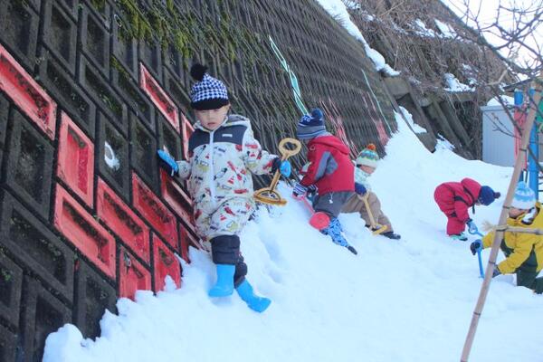 男の子たちは、コンクリート壁に沿ってたまった1メートル以上の高さの雪の上を歩きながら、埋まるか埋まらないかのドキドキ感を楽しんでいたようです。積もった高い雪の上からの景色は、雪のない時期とは違って見えたようで、得意顔でしたよ!