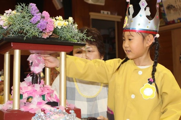 昨日は以上児が遊戯場に集まってまゆだまの会を行いました。まゆの不思議やまゆだま飾りの意味を子どもたちに知らせたり、みずきに色とりどりのまゆ(市販の見立てたもの)や縁起物の飾りをつけたりしました。