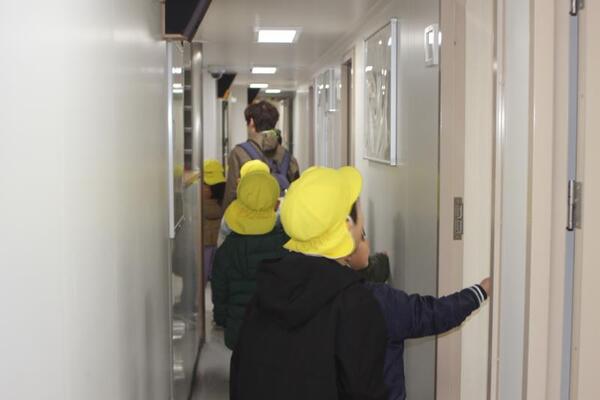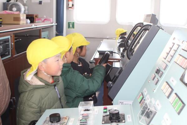 この日は船内の運転室・食堂・実習生の部屋・お風呂など、あちこち見せていただきました。特に実習生の4人部屋の二段ベッドや、船内とは思えない大きなお風呂には子どもたちは興味津々でした。