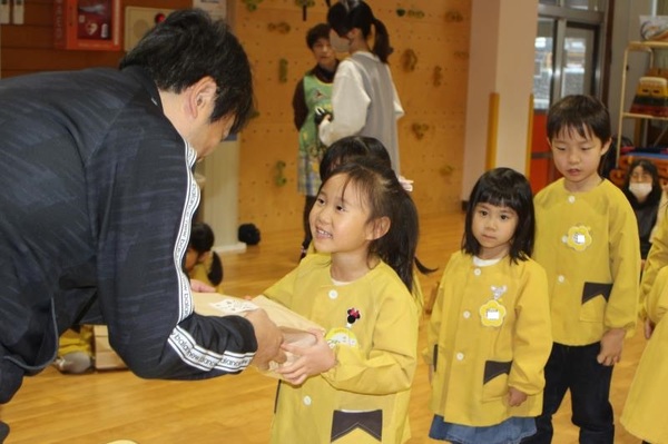 今日は、能生地区公民館からお声がけをいただき、能生楽習館でのもちつき大会にひかり組さんとまりん組さんが参加させていたさきました。今日の気温は今シーズン最低の1℃。積もるまではいきませんがちらちらと雪が風に舞う寒い日となりました。しかし、もちつき大会の会場である楽習館のフロアは、白いモチ米から湯気が上がる大きな臼を囲んでワイワイと賑やかであたたかでした。子どもたちはねじりハチマキを頭にやる気満々!