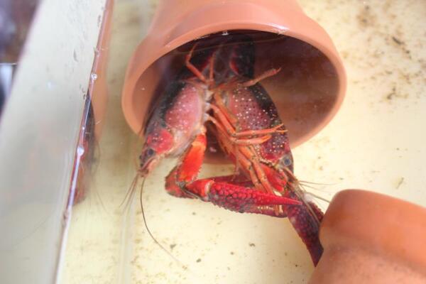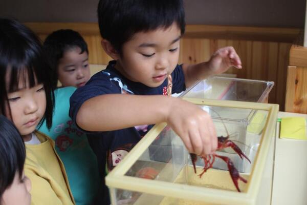 さっそくまりん組が飼育していたオスのザリガニと、8月からシングルで飼っていたメスのザリガニを一緒にしてみました。すぐに仲良くなり、うまくいきそうです!今後こちらも卵がおなかにつくかも!まりん組さんは楽しみにしています!