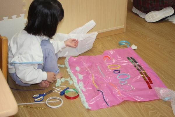 まずひかり組さんが始めたのは、本堂にお越しいただいた大人の方にプレゼントするためのお念珠作りです。お念珠の珠の数が決められているので図を見て「1・2・3…」と、いっしょうけんめい数えながらのお念珠作りです。小さな玉の穴に紐を通すのもなかなか難しく、紐の先を斜めにカットしたりボンドで固めたりしての挑戦です。「ありがとう」の気持ちを込めながら一つひとつ作っていきます。